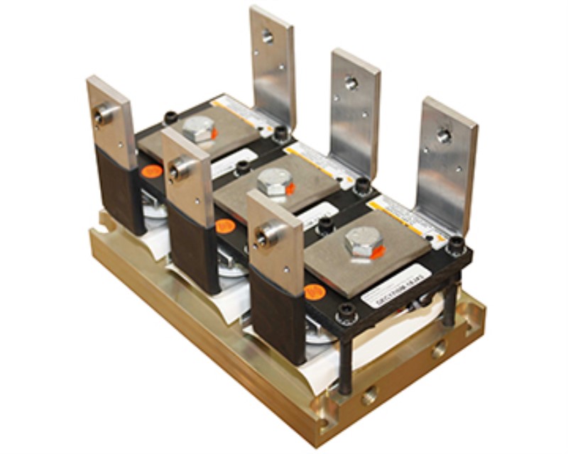 For three phase controls, Darrah offers its line of indirect water cooled contactors mounted on a triple chill block. Choose from either of the three bus tang connections and have Darrah Mount them on our specially designed triple heat sink. This means one pair of water connections cool three contactors. Darrah's Tri-Pack design is compact, thus eliminating bulky cabinets and excessive water connections.