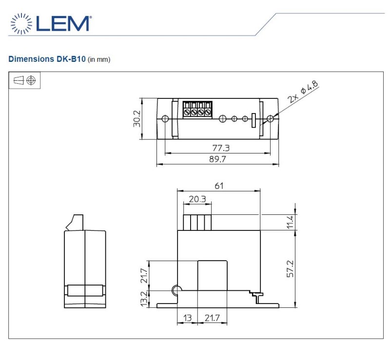 Split core transducer for the electronic measurement of DC current, with galvanic separation between the primary circuit and the secondary circuit. 0-10 V DC output voltage proportional to measured current.