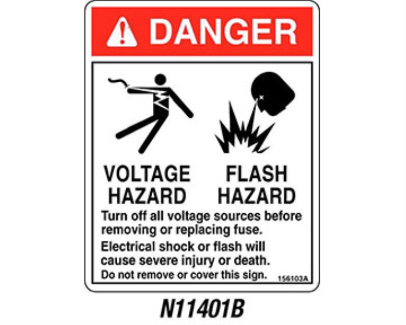 Turn off all voltage sources before removing or replacing fuse. Electric shock or flash will cause severe injury or death. Do not remove or cover this sign.