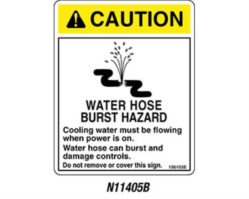 Cooling water must be flowing when power is on. Water hose can burst and damage controls. Do not remove or cover this sign.