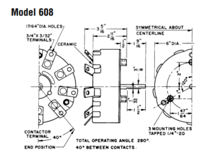 The 608 series high-current non-shorting Power Tap Rotary Switch constructed to provide dependable and convenient operation. It has 15 to 100A current rating, has ceramic arc-proof bodies and metal alloy contacts. It is a reinforced non-metal body and solid metal alloy contacts, all-soldered and -riveted construction assures mechanical and operational integrity. It features high current handling capability in a small package. It has maximum 1-inch panel, three 1/4-20 flat-head machine screws 11/4-inch long, 7/16-inch drill hole in panel for 3/8-inch shaft.